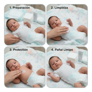 Prepárate: Ten todo listo antes de empezar: un pañal limpio, toallitas húmedas o algodón con agua tibia (lo mejor para recién nacidos), y crema para rozaduras (si es necesario).
