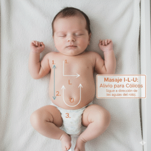 Masajes en la Panza: Con el bebé acostado, haz movimientos circulares suaves en el sentido de las manecillas del reloj (siguiendo el recorrido del intestino). También puedes usar la técnica I-L-U: traza una “I” invertida, luego una “L” invertida y finalmente una “U” invertida sobre el abdomen.