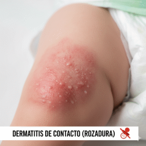 ¿Qué es? Una erupción roja, a veces con pequeños bultos o escamas, que aparece en áreas que han estado en contacto con algo irritante. La más común es la dermatitis de pañal (que ya vimos), pero también puede ser por ropa nueva sin lavar, jabón fuerte, suavizante de ropa, etc.